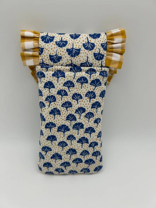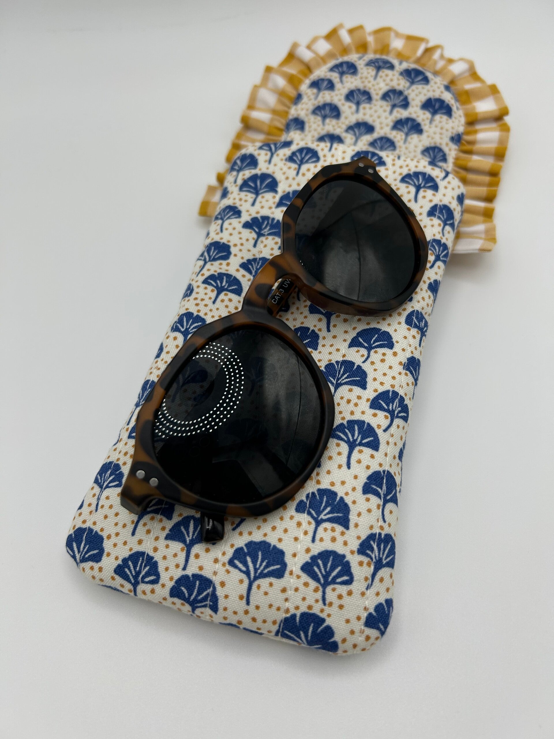 A wildly cute way to keep your sunnies unscathed, this sunglasses case is made in gorgeous floral Liberty of London fabric with a lightly quilted finish, complemented by beautiful gingham ruffle. Fastens with a magnetic button. This glasses pouch is the perfect combination of style and functionality. Whether you’re traveling or just need to keep your glasses clean at home, this pouch is sure to meet all of your needs.