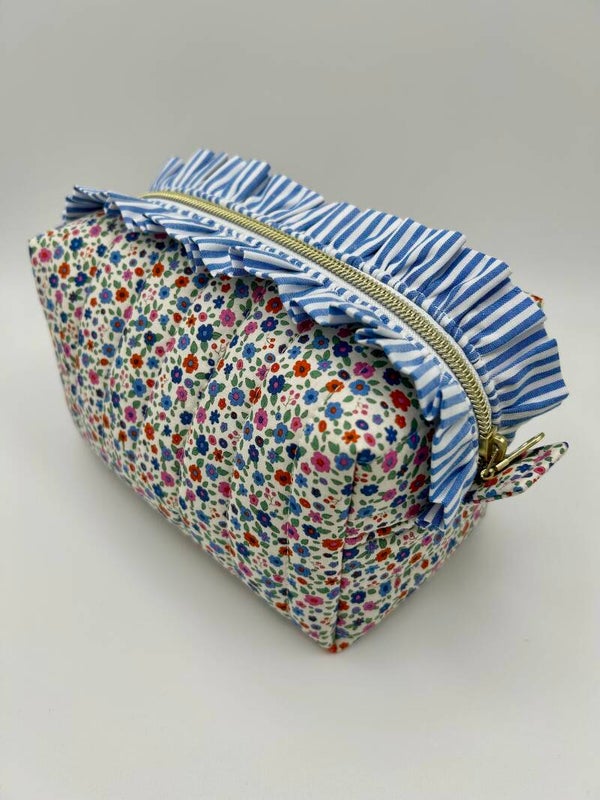 A must-have for travelling, gorgeous floral print quilted wash bag, complemented b beautiful blue and white stripe ruffle. This bag is compactable and fully lined with a water resistant material. They are the perfect size for keeping your toiletries/makeup organised while on the go and offer a stylish way to store products on your bathroom shelf. All products are handmade by Emilia at Ma.Len Studio.