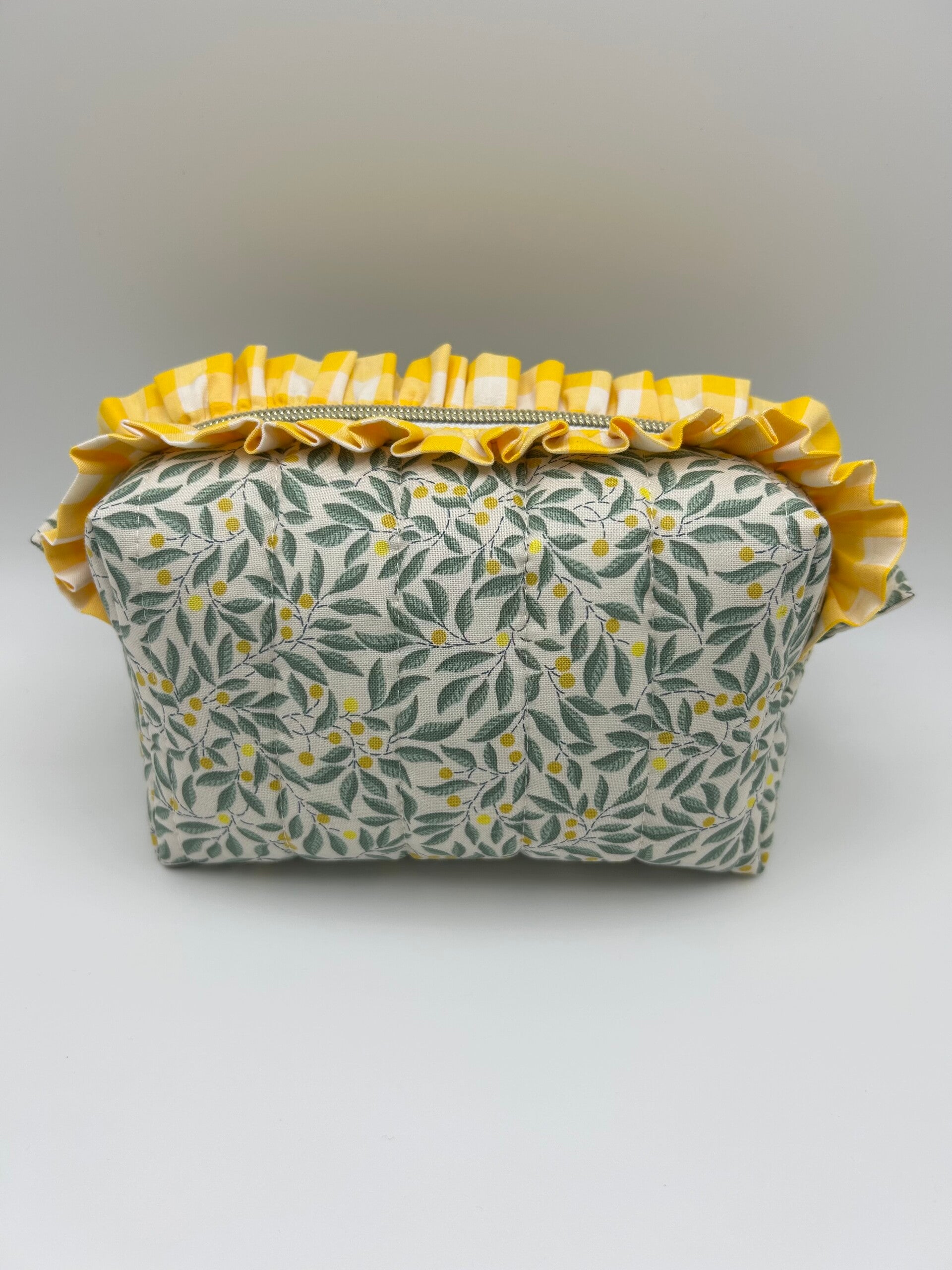 A must-have for travelling, gorgeous liberty print quilted wash bag, complemented by beautiful contrasting gingham ruffle. This bag is compactable and fully lined with a water resistant material. They are the perfect size for keeping your toiletries/makeup organised while on the go and offer a stylish way to store products on your bathroom shelf. All products are handmade by Emilia at Ma.Len Studio.