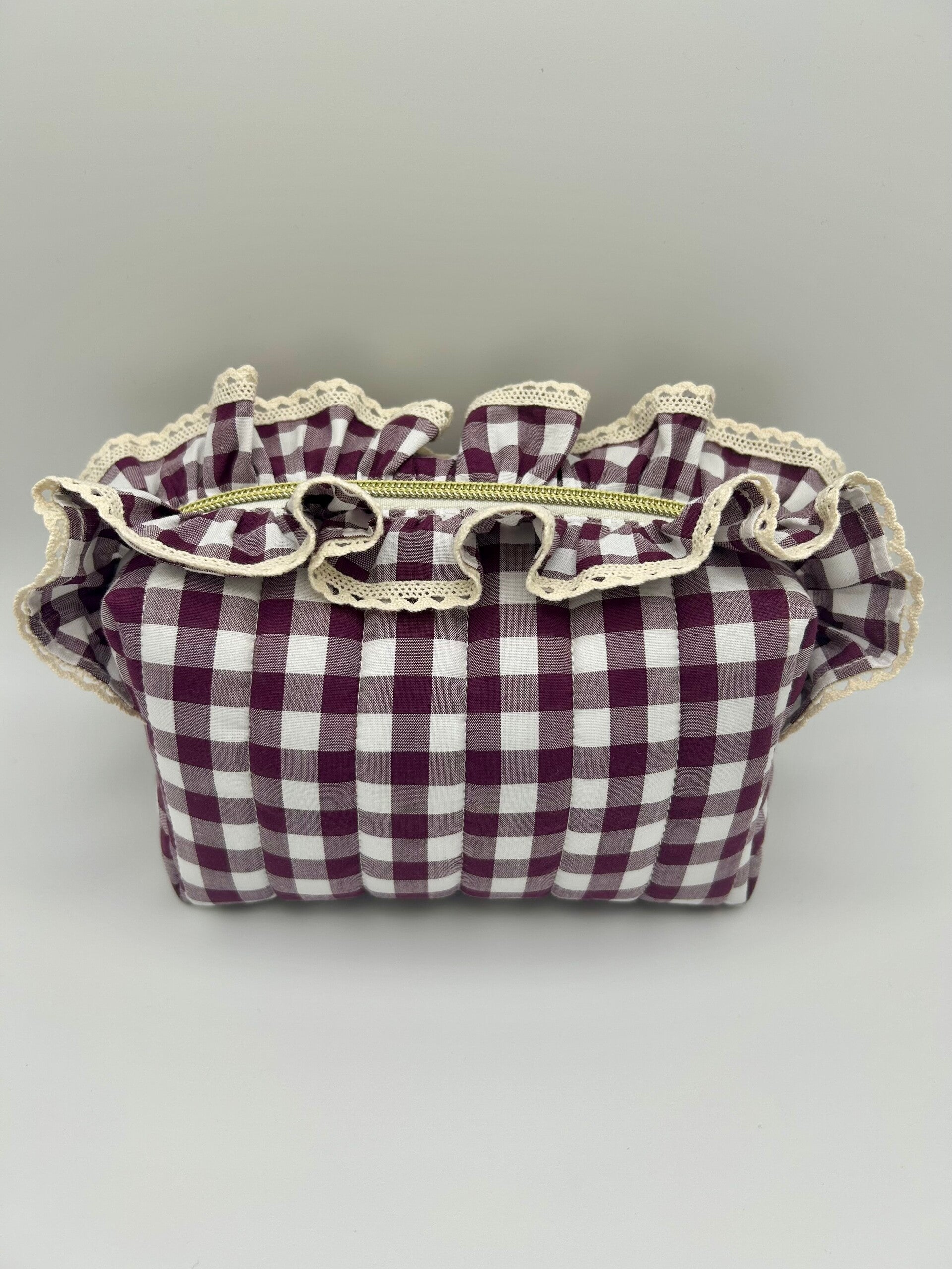A must-have for travelling, gorgeous plum gingham print quilted wash bag, complemented by beautiful ruffle in the same fabric and a lace scalloped trim. This bag is compactable and fully lined with a water resistant material. They are the perfect size for keeping your toiletries/makeup organised while on the go and offer a stylish way to store products on your bathroom shelf. All products are handmade by Emilia at Ma.Len Studio.