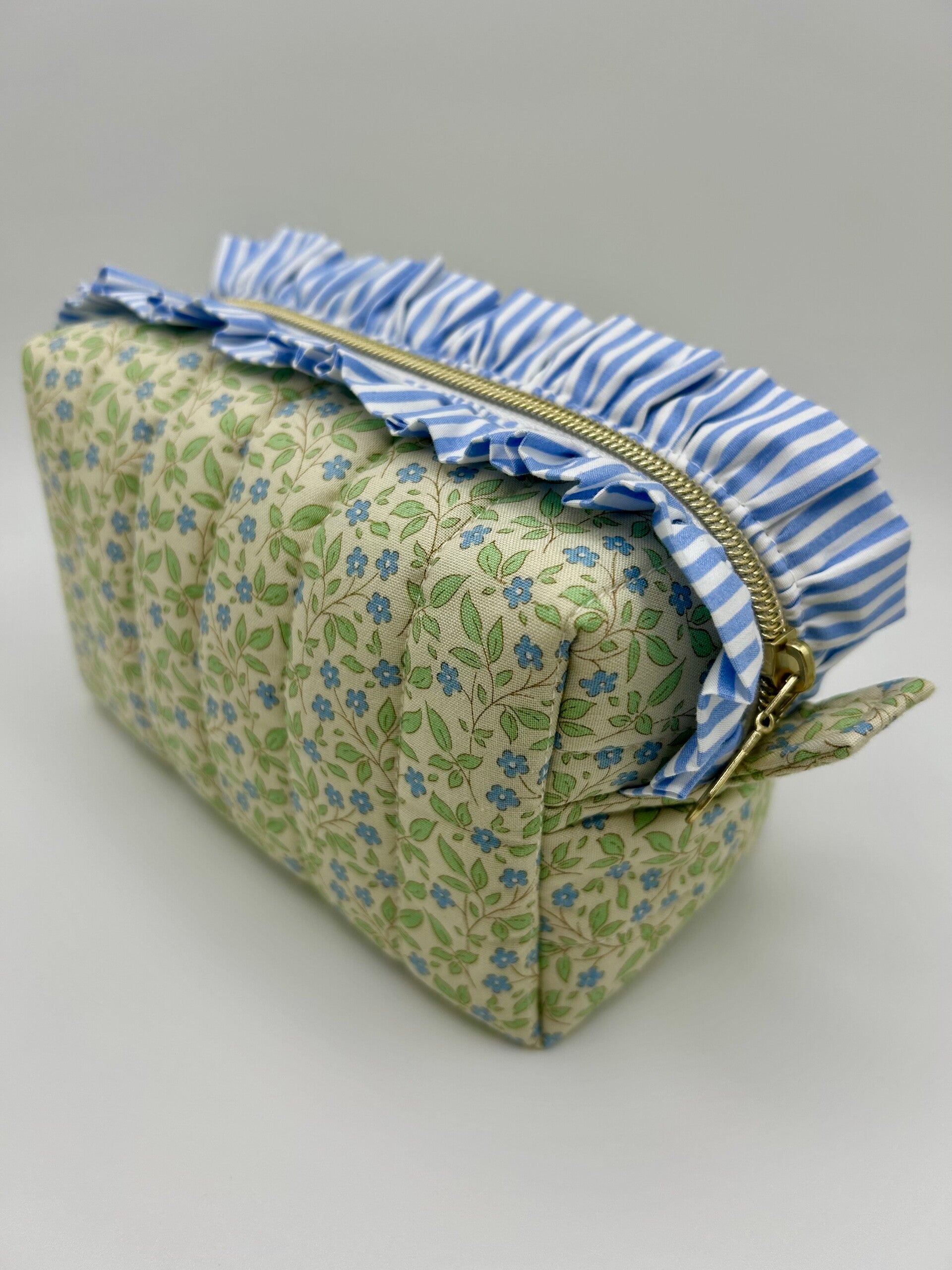 A must-have for travelling, gorgeous floral print quilted wash bag, complemented b beautiful blue and white stripe ruffle. This bag is compactable and fully lined with a water resistant material. They are the perfect size for keeping your toiletries/makeup organised while on the go and offer a stylish way to store products on your bathroom shelf. All products are handmade by Emilia at Ma.Len Studio.