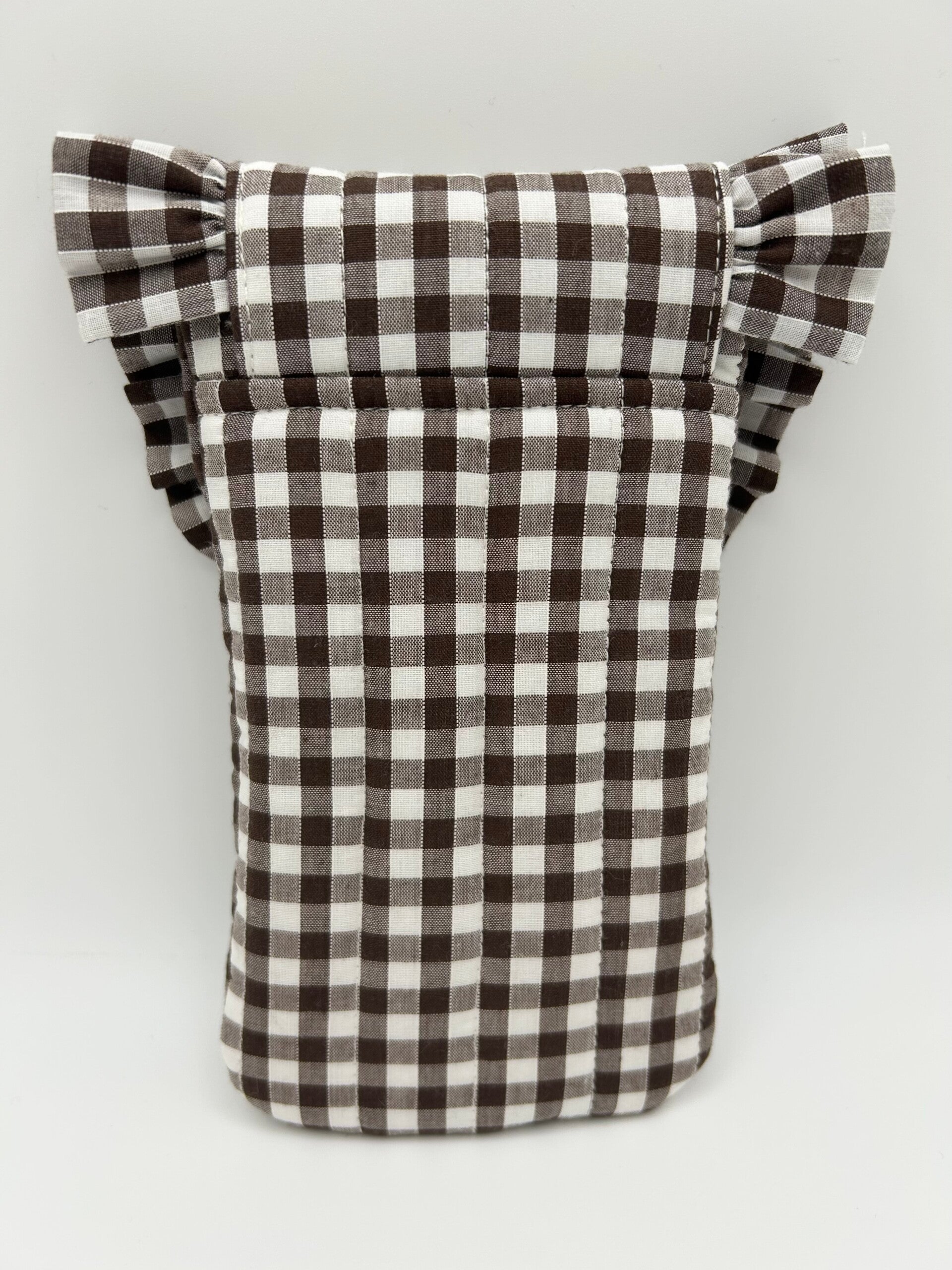 Stylish and cool way to keep your sunnies unscathed, this sunglasses case is made in gorgeous chocolate gingham fabric with a lightly quilted finish, complemented by beautiful ruffle. Fastens with a magnetic button. This glasses pouch is the perfect combination of style and functionality. Whether you’re traveling or just need to keep your glasses clean at home, this pouch is sure to meet all of your needs.