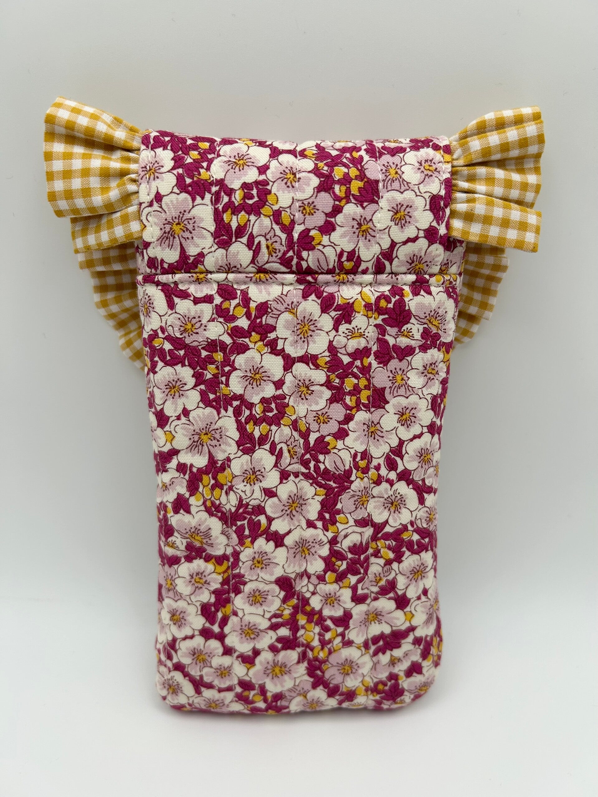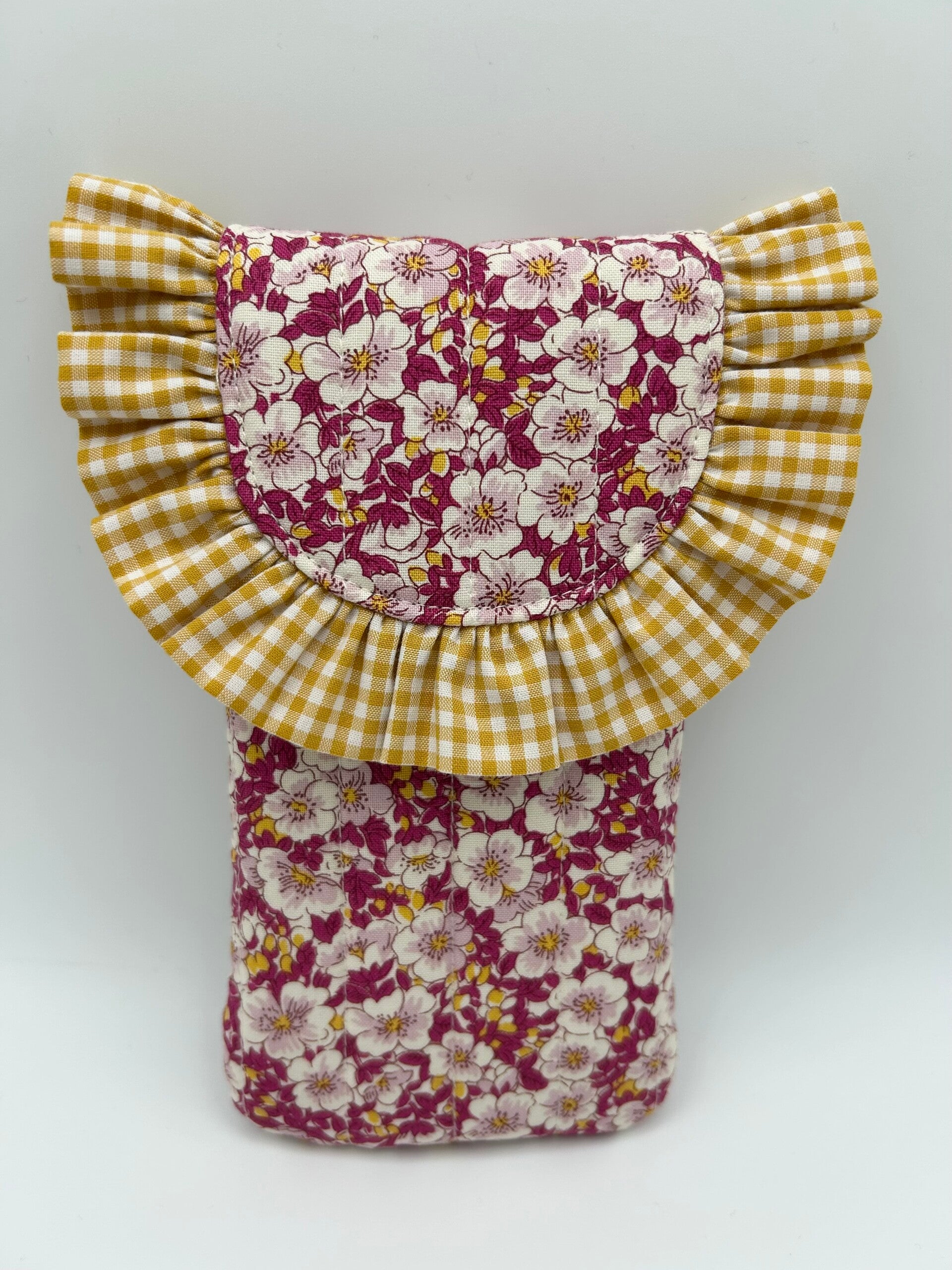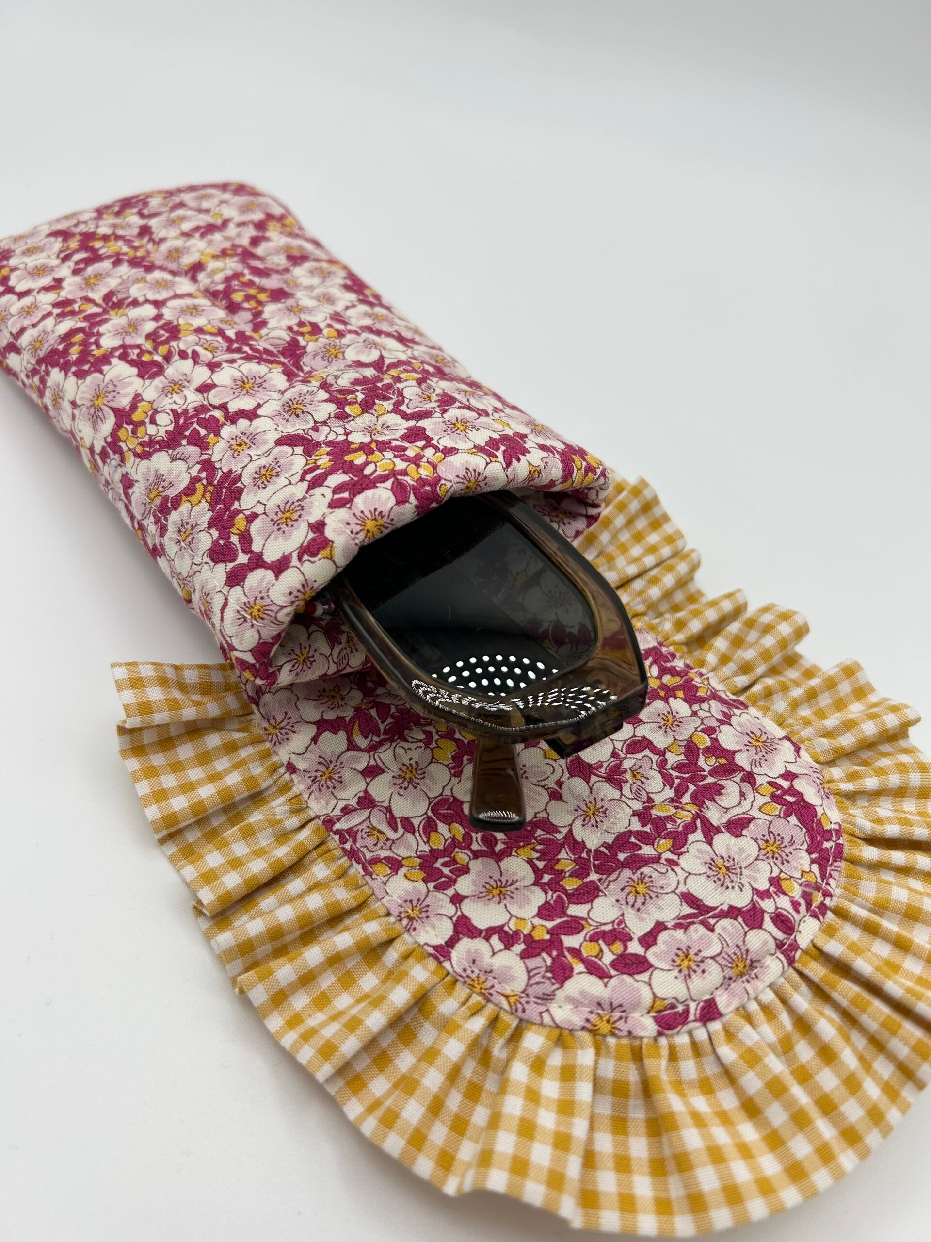 Stylish and cute way to keep your sunnies unscathed, this sunglasses case is made in gorgeous floral Liberty of London fabric with a lightly quilted finish, complemented by beautiful gingham ruffle. Fastens with a magnetic button. This glasses pouch is the perfect combination of style and functionality. Whether you’re traveling or just need to keep your glasses clean at home, this pouch is sure to meet all of your needs.